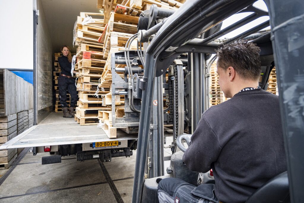 De pallets staan klaar voor transport en gaan op voor een nieuwe ronde!